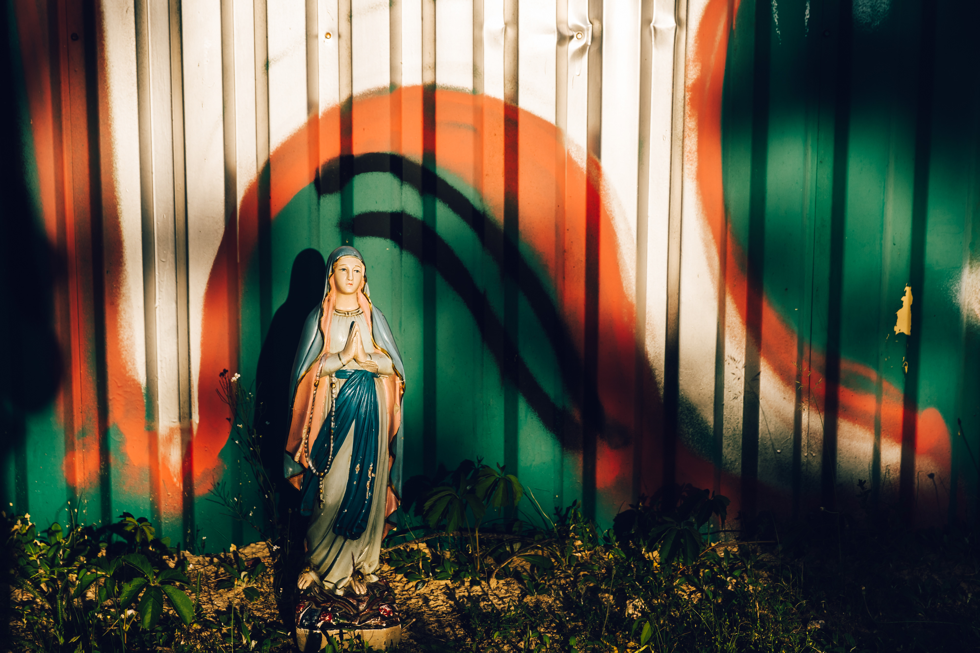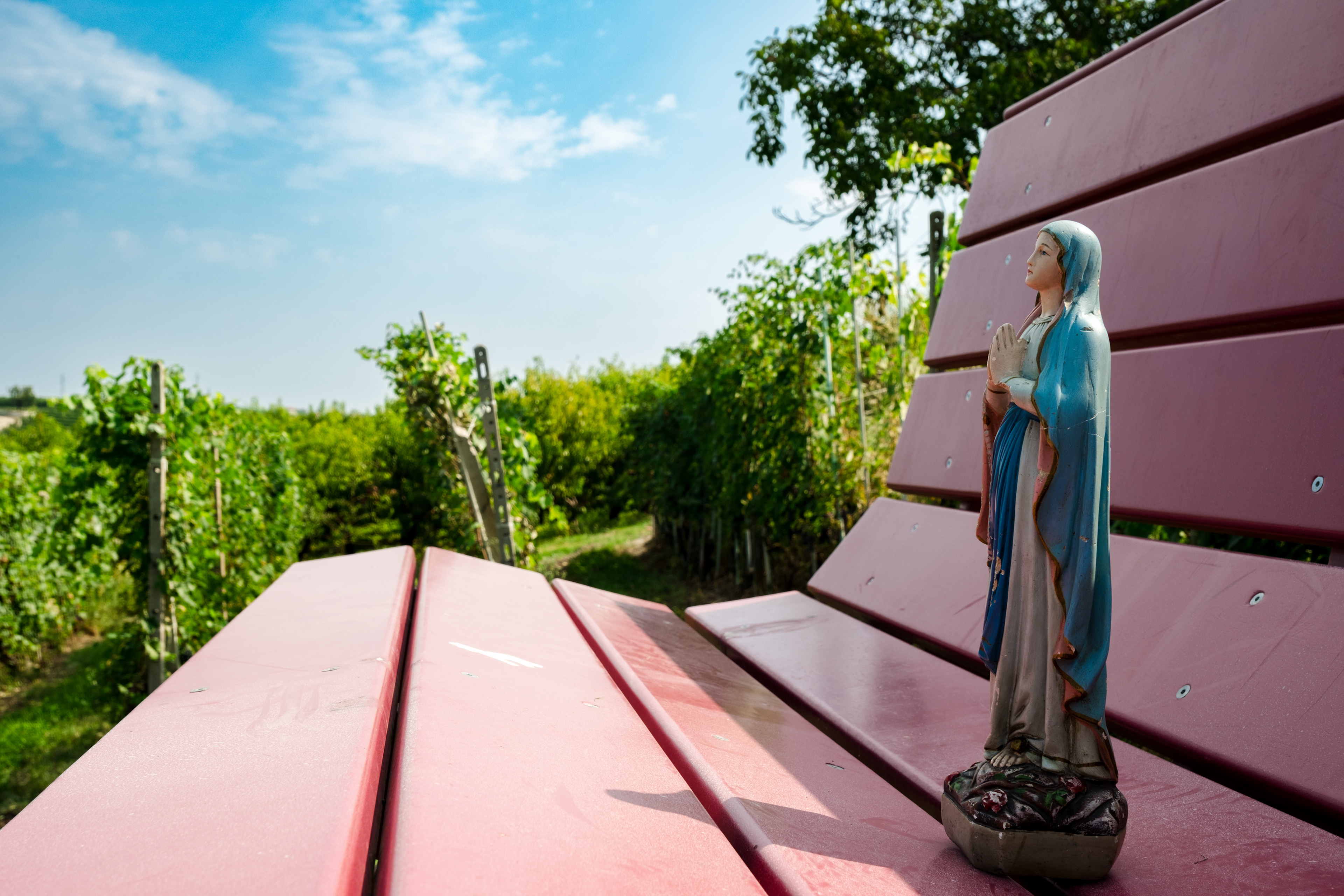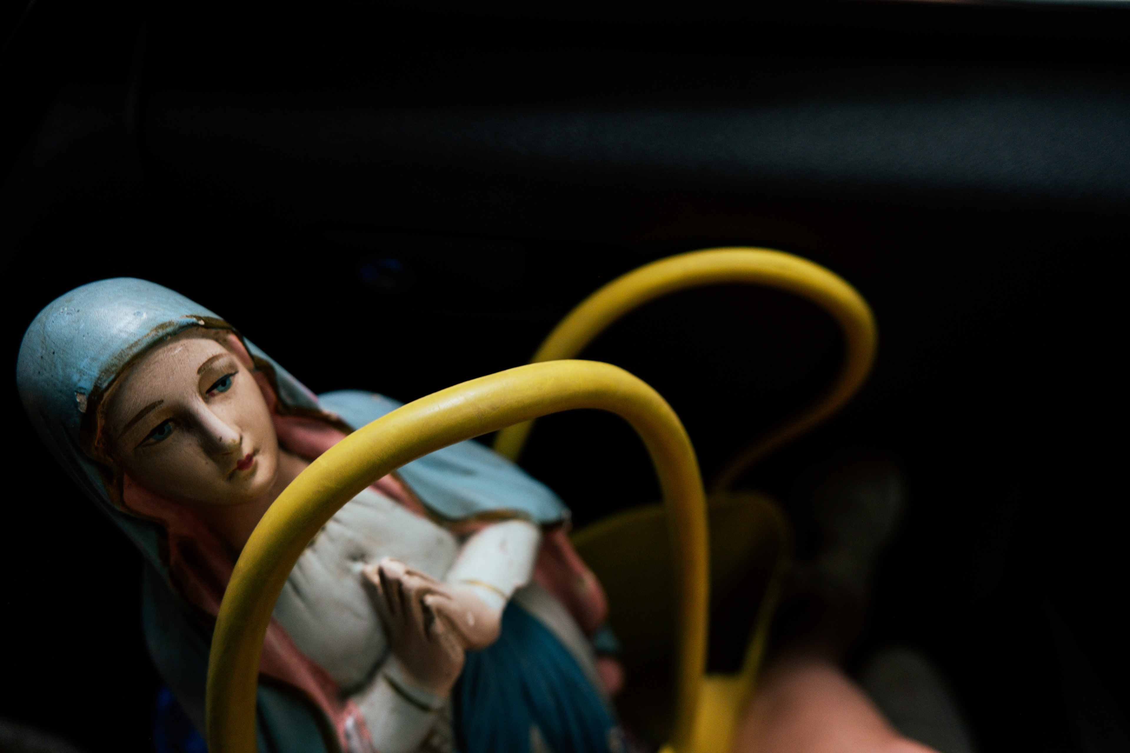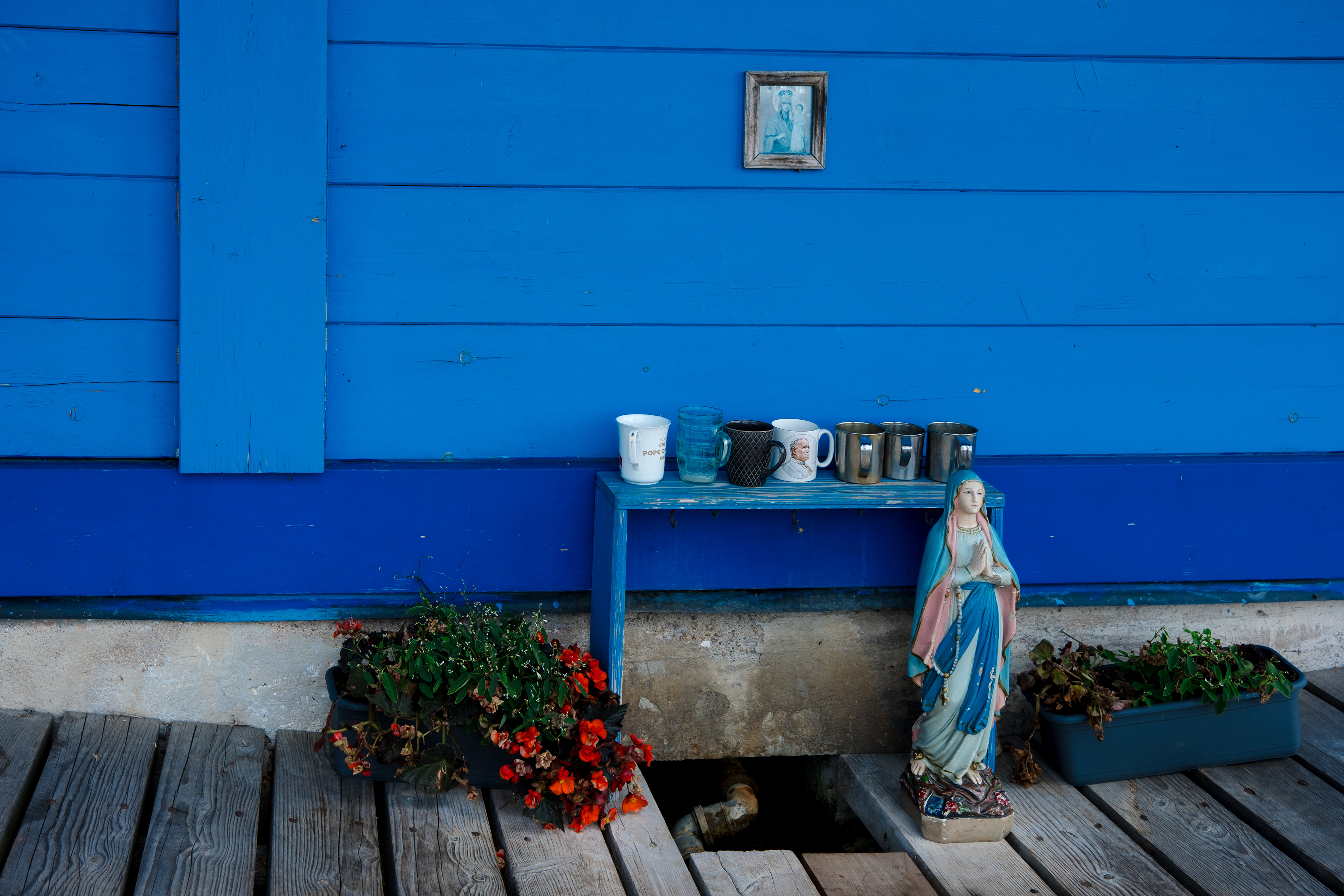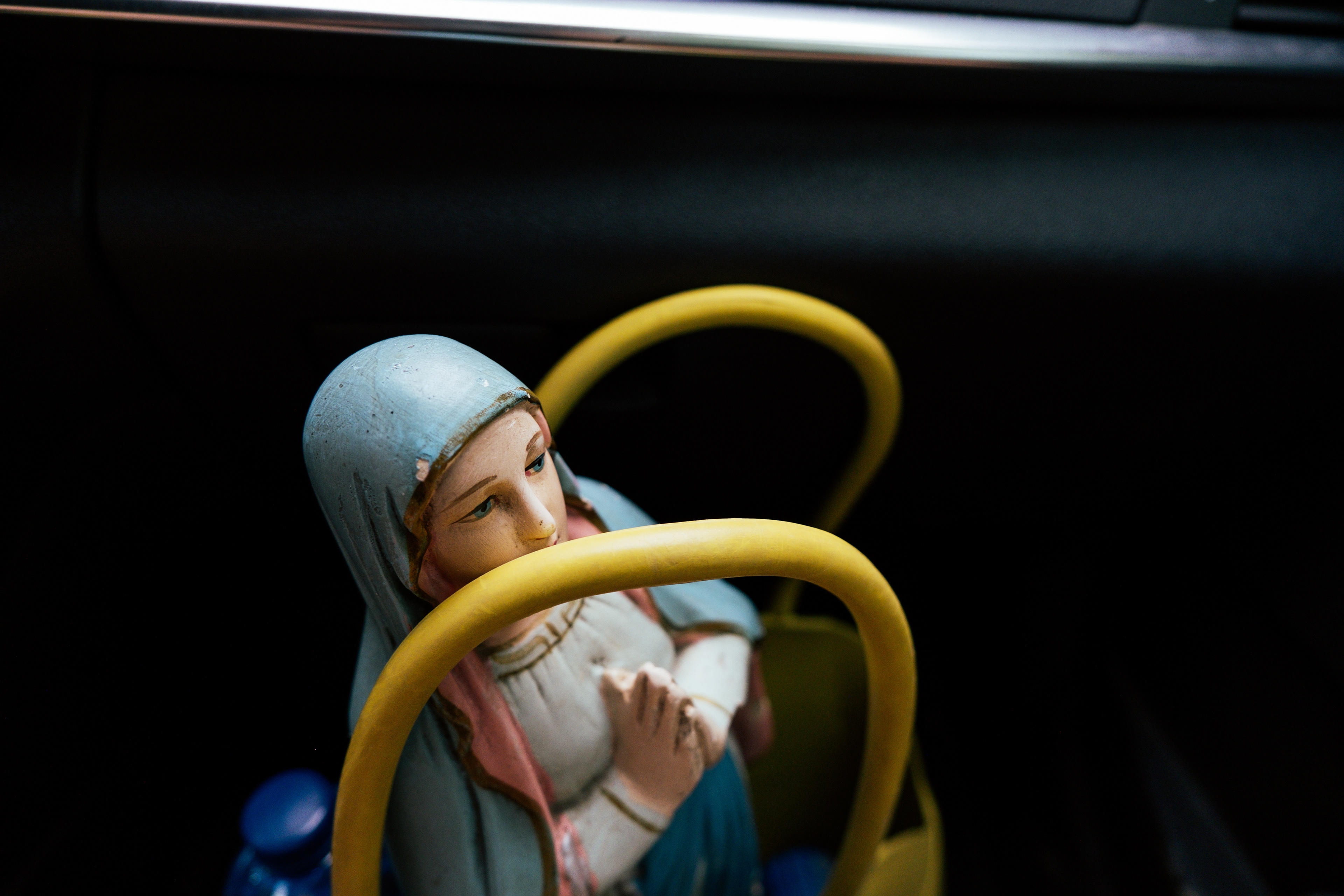 W czasie naszej podróży spotykam wiele osób, w wielu miejscach dla których Matka Boska jest bardzo ważna. Pewnego dnia w sycylijskiej miejscowości Canicattini Bagni, gdy robiłam zdjęcia tamtejszym kamieniczkom zastałam zaproszona do domu jednego z mieszkańców. Jakie było moje zdziwienie, gdy pośród przedmiotów, których kolekcję zgromadził właściciel była także figurka Matki Boskiej. A raczej figura, bo miała wzrost kilkuletniego dziecka. Albo na peryferiach Bari w sklepie-barze rybnym odkryliśmy dwa imponujące ołtarzyki z Madonnami. Na jednym z nich postawiłam swoją figurkę.