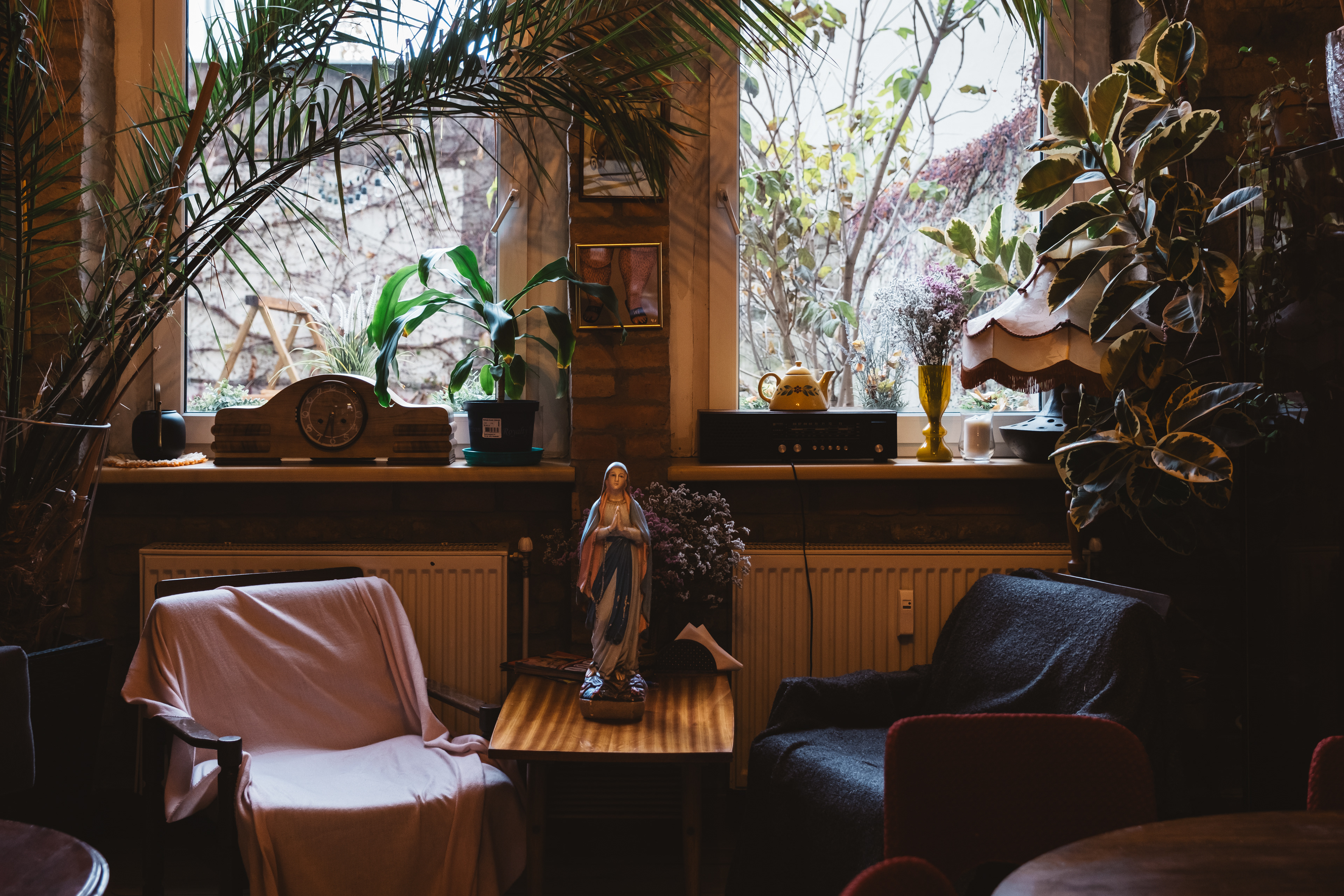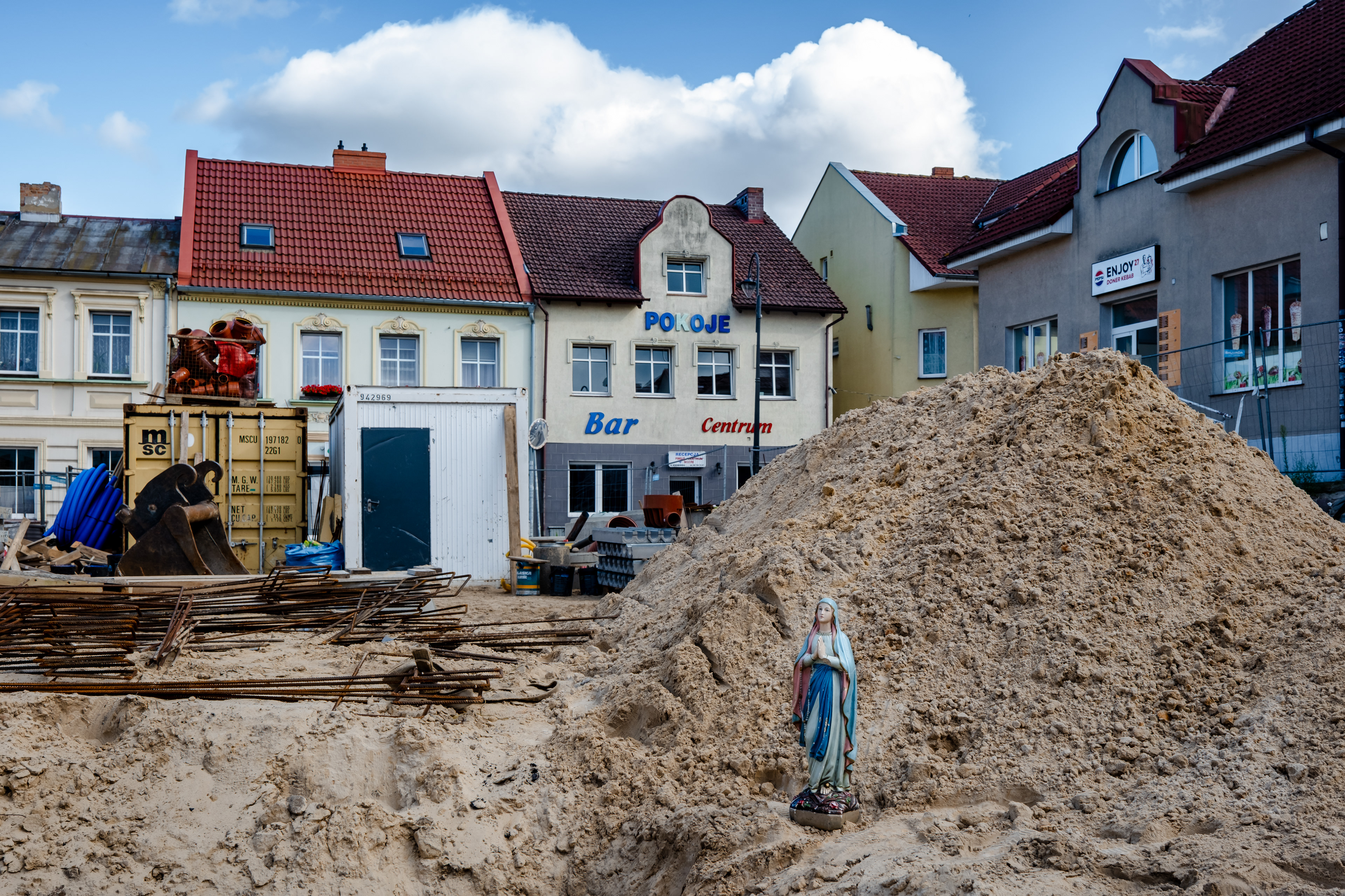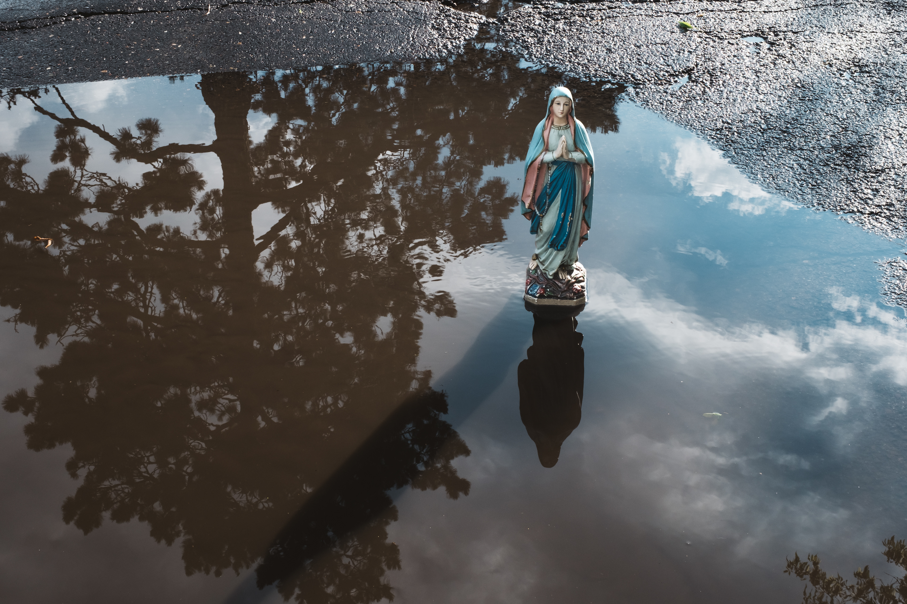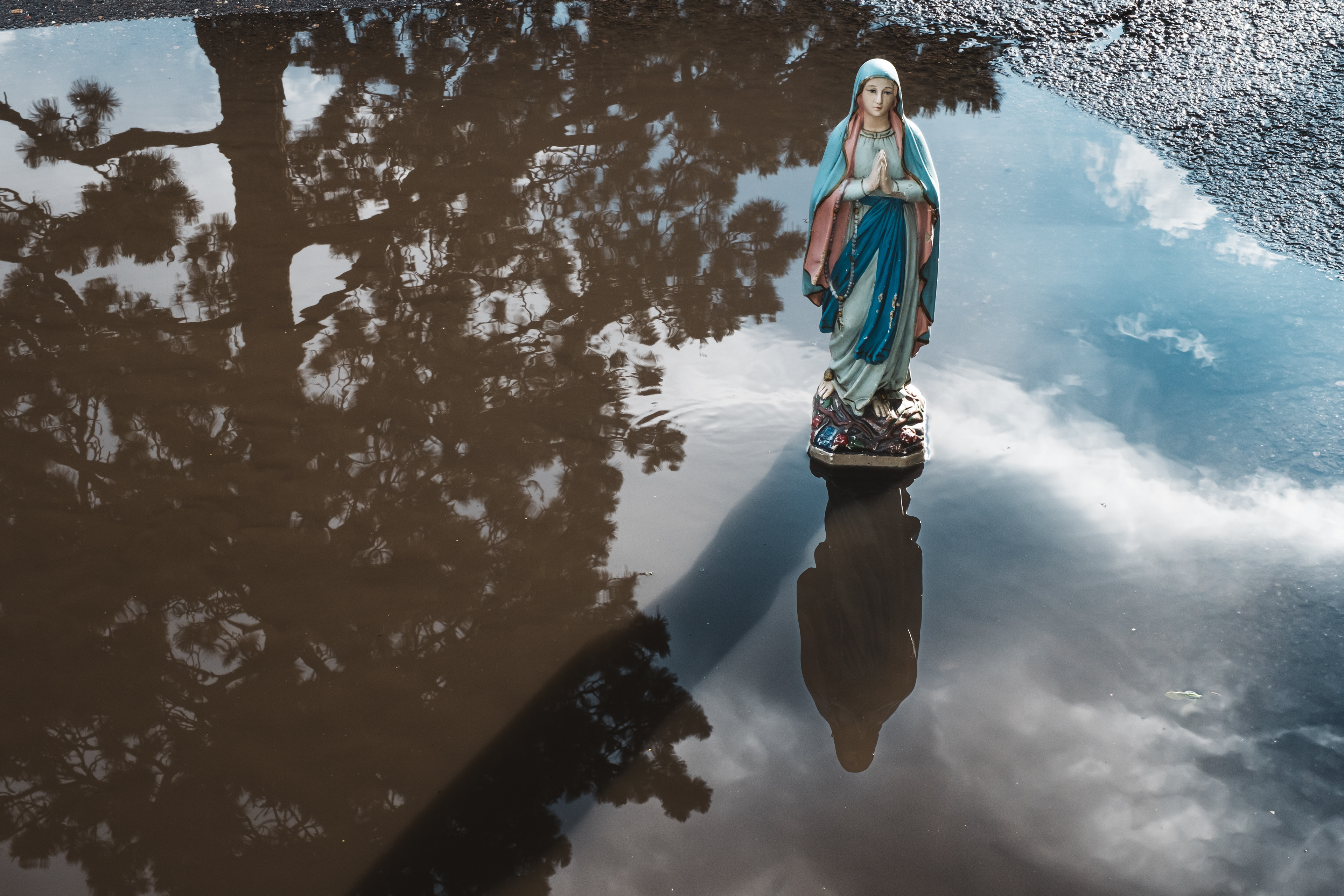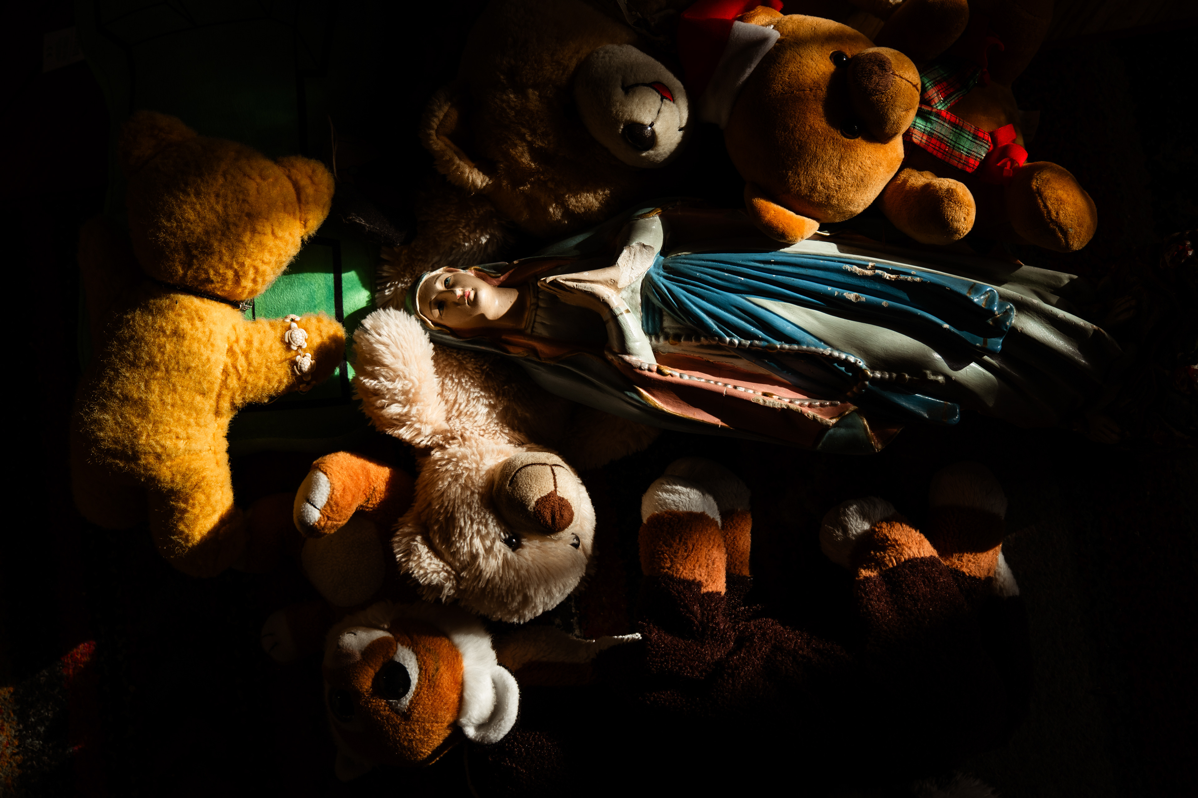 W czasie naszej podróży spotykam wiele osób, w wielu miejscach dla których Matka Boska jest bardzo ważna. Pewnego dnia w sycylijskiej miejscowości Canicattini Bagni, gdy robiłam zdjęcia tamtejszym kamieniczkom zastałam zaproszona do domu jednego z mieszkańców. Jakie było moje zdziwienie, gdy pośród przedmiotów, których kolekcję zgromadził właściciel była także figurka Matki Boskiej. A raczej figura, bo miała wzrost kilkuletniego dziecka. Albo na peryferiach Bari w sklepie-barze rybnym odkryliśmy dwa imponujące ołtarzyki z Madonnami. Na jednym z nich postawiłam swoją figurkę.
